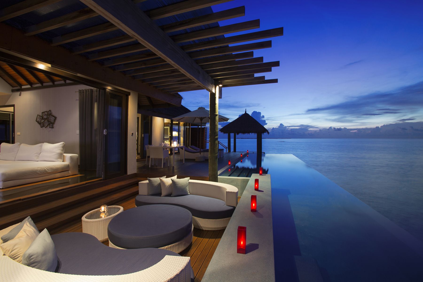 There is a good selection of accommodation options to suit different budgets (ten types in total), from beach bungalows to overwater villas and suites. We stayed in a water bungalow with pool, and while the beach villas are a popular choice at Velassaru, the over-water bungalows with private pool are indeed superior. Each water bungalow features a private ocean view deck with pool and private steps leading straight into the sea, where you can swim and snorkel; there is an abundance of brightly coloured fish and even small sharks (friendly species of course!). Sumptuously squashy sun loungers with plush-cushions sat on our terrace with small tables to place essential drinks from the mini bar.